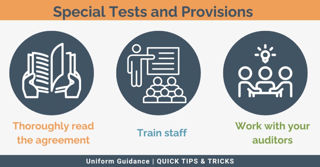 - Thoroughly read the grant agreement and compliance supplement to identify any special tests or provisions related to your federal program.Â