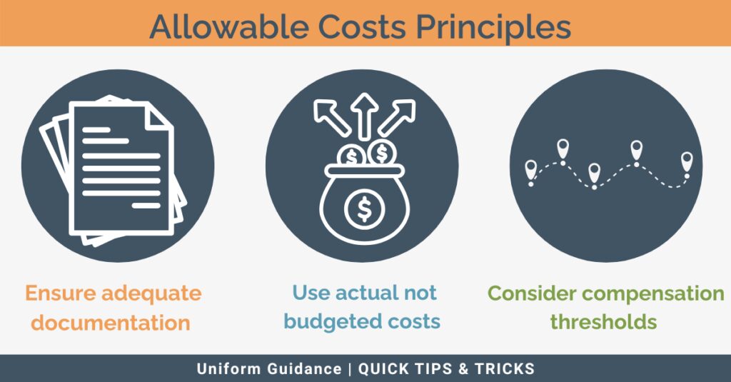 The second compliance requirement relates to allowable costs principles. This requirement requires that any costs allocated to a federal award must meet specific criteria to be considered legitimate and reimbursable. Key criteria that costs must meet in order to be considered allowable include the following:Â
