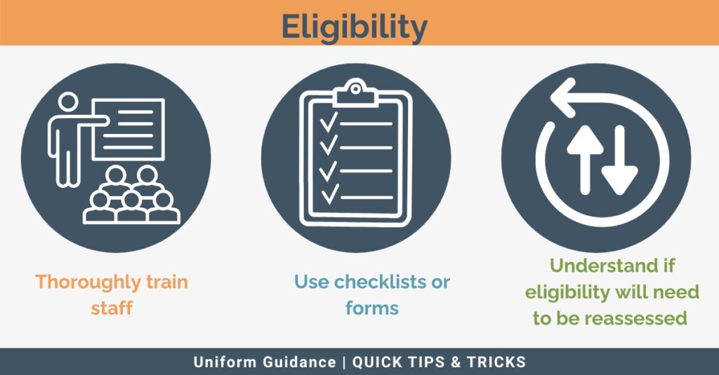 - Eligibility may need to be reassessed and recertified at various points established by the program, so thoroughly read the federal award agreement to ensure these requirements are understood and appropriate policies established.Â