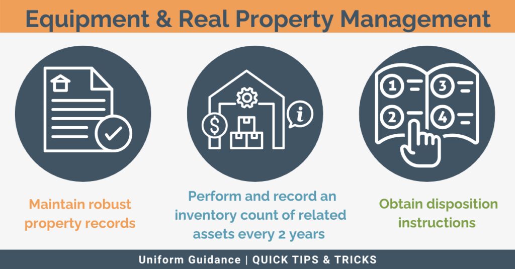 The fifth compliance requirement governs equipment and real property management. This requirement is designed to ensure that federally funded assets are properly used, maintained, tracked and disposed of in accordance with federal rules. These assets are generally defined as tangible property with a useful life of more than one year and an acquisition cost of $10,000 or more ($5,000 for federal awards made prior to October 1, 2024).Â