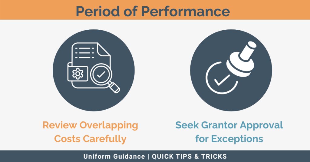 - In certain instances, approval may be given from the grantor to make an exception for costs incurred within a specified timeframe before or after the period of performance. Be sure to ask for formal approval before charging these costs to the federal award.Â